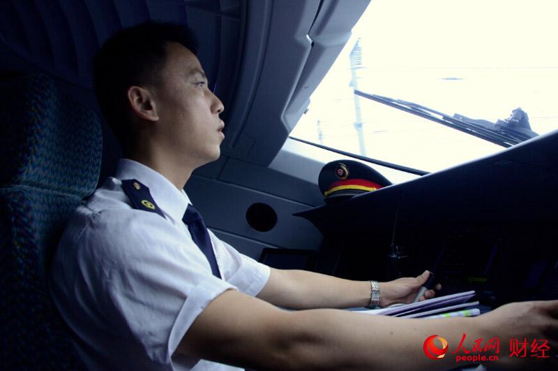 Xu Xiaolin, 37-year-old driver of the train, makes preparation in the cabin. (Photo/People's Daily Online)