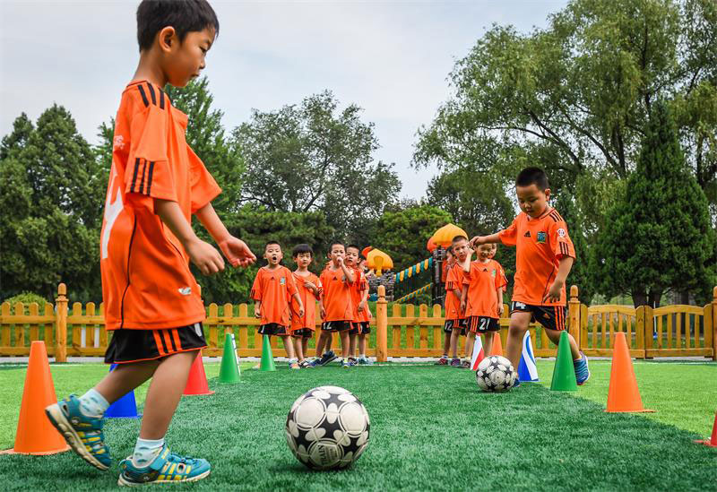Beijing Liuyi Kindergarten established its first football team made up of young children and built an artificial pitch covering nearly 200 square meters. For each football class, these children undergo serious training on the pitch.(Photo/Xinhua)