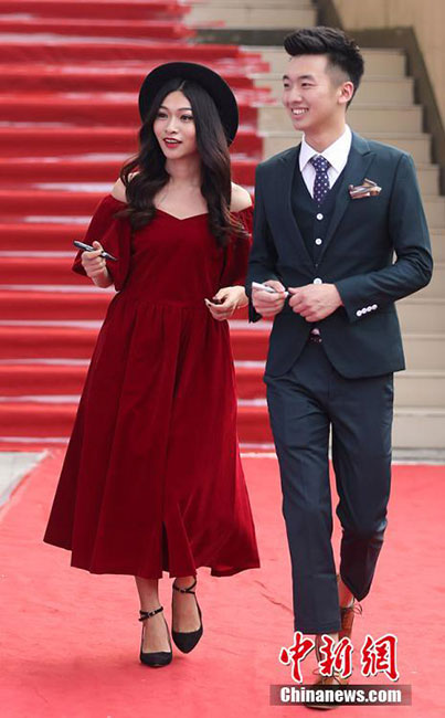 Many graduates of Communication University of China at Nanjing wearing ceremonial dress walk on the red carpet in Nanjing on June 20, 2015. They commemorate their university lives in this unique 'Film Festival'.