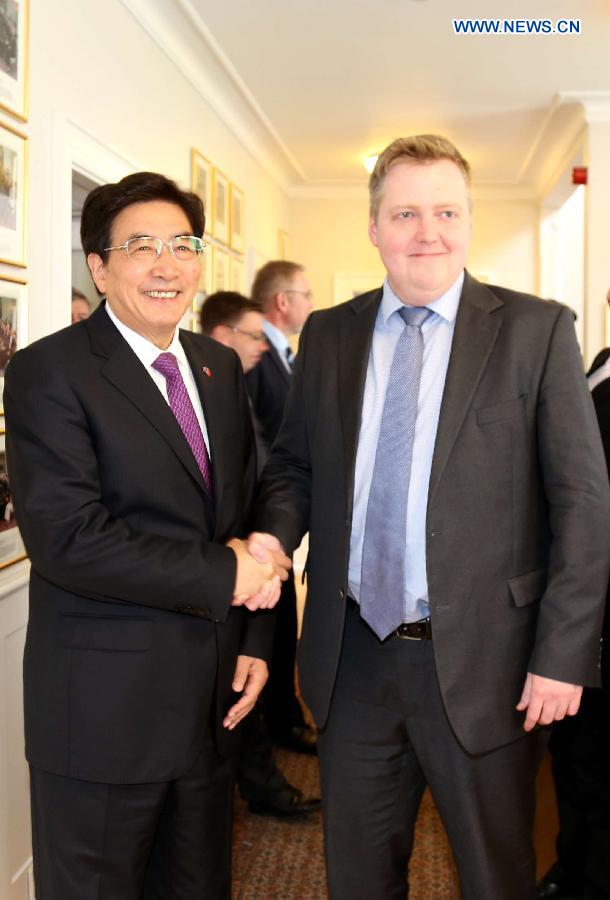 | Iceland's Prime Minister Sigmundur David Gunnlaugsson (R) meets with Guo Jinlong, a member of the Political Bureau of the Communist Party of China (CPC) Central Committee and secretary of the CPC Beijing Municipal Committee, in Reykjavik, capital of Iceland, on June 23, 2015. (Xinhua/Huang Xiaonan) |