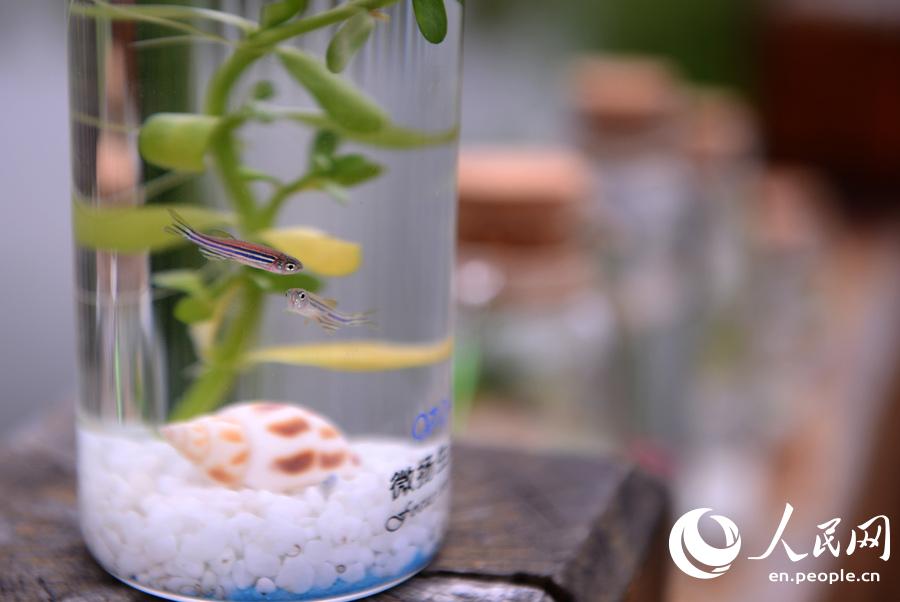 Several students majoring in bioscience and engineering in Fuzhou University in southeast China’s Fujian province invented a micro-ecological fish bottle which has a stable ecosystem. The bottle contains basic elements of a food cycle, including fishes, green plants, snails and microorganism, so the fish barely needs feeding or changing water. With the support of Fuzhou University, the fish bottle has been put into market — students of the R&D team have established a company to sell their products. (Xinhua/Jiang Kehong)