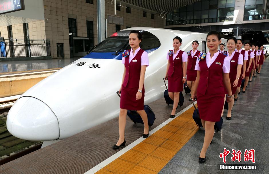Stewardesses for Hefei-Fuzhou high speed rail show up in new uniform