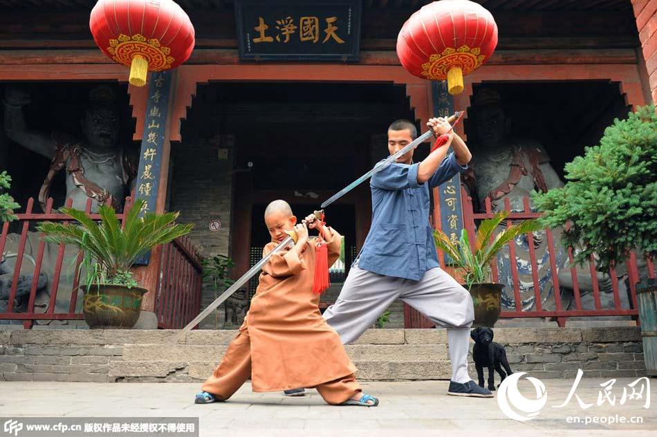 The cute little "monk" Kele practices sword with his master at Zishou Temple in Lingshi county, north China's Shanxi province. (Photo/CFP)