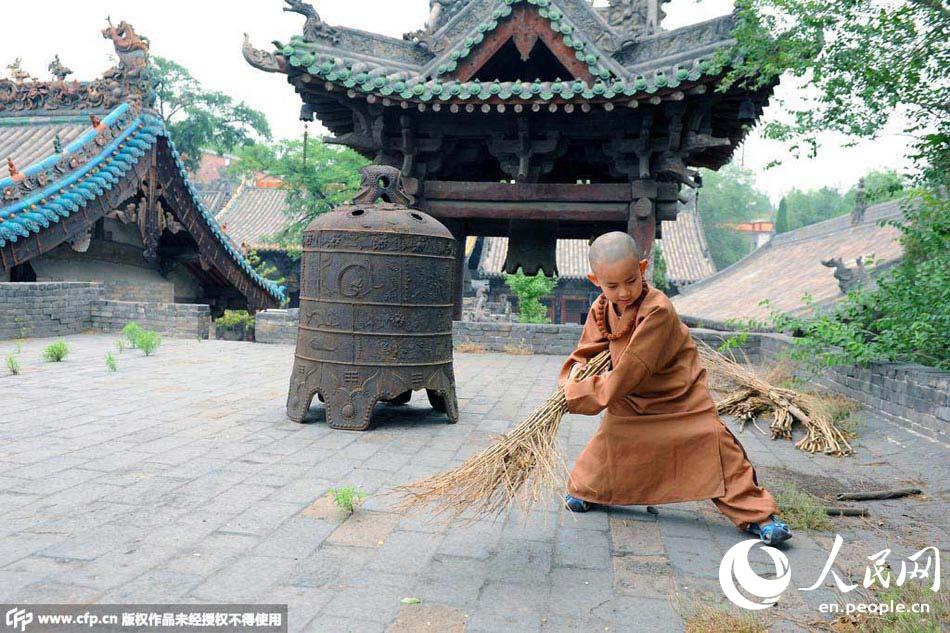 The cute little "monk' Kele cleans the ground with a broom at Zishou Temple in Lingshi county, north China's Shanxi province. (Photo/CFP)