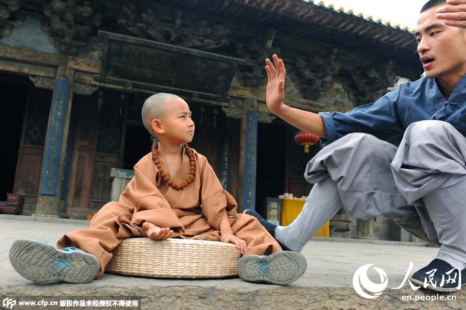 The cute little "monk" Kele practices with his master at Zishou Temple in Lingshi county, north China's Shanxi province. (Photo/CFP)
