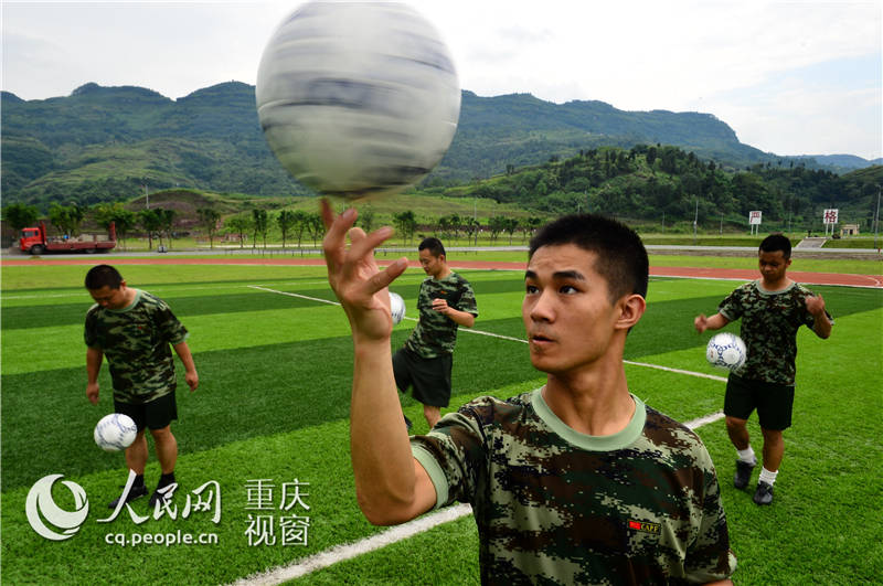 Soldiers practice football techniques in Chongqing, southwest China. (Photo/cq.people.cn)