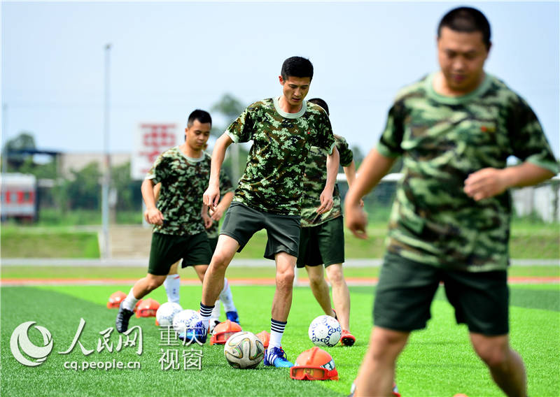 Soldiers practice football techniques in Chongqing, southwest China. (Photo/cq.people.cn)