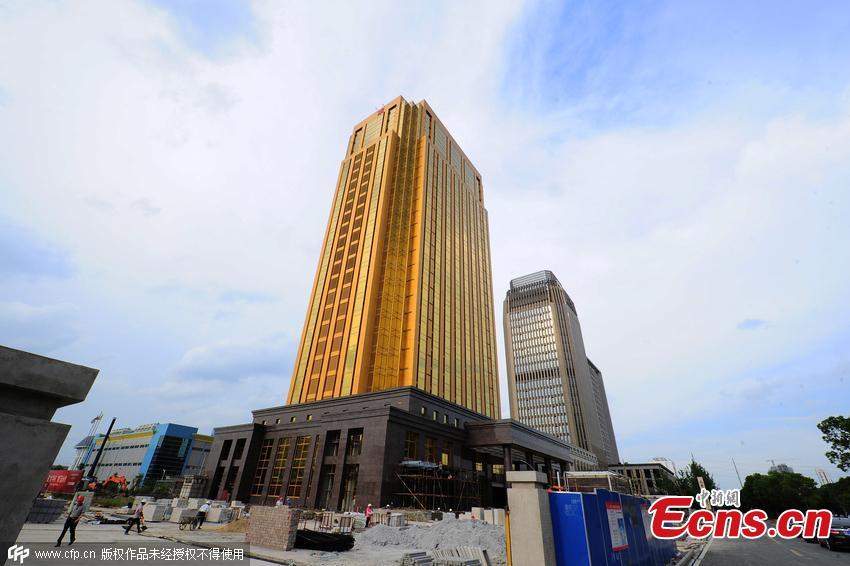 An office building glows under sunlight in Kunshan city, East China’s Jiangsu province, June 26, 2015. The 28-storey building is 99.9 meters high and has a yellow exterior, earning it the nickname of "gold bar building". (Photo/Ecns.cn)