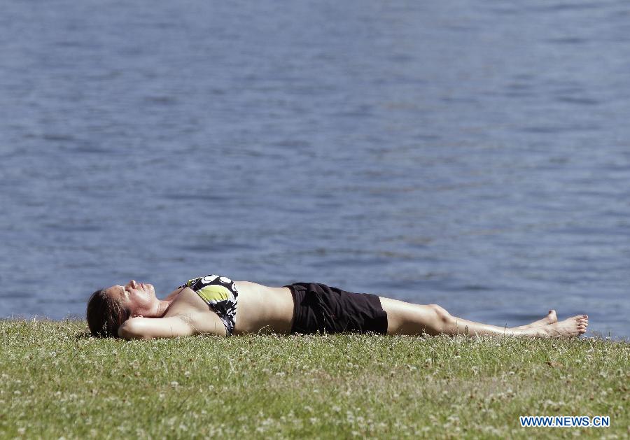 A resident enjoys sun tanning at a park in Vancouver, Canada, June 27, 2015. According to the weather forecast from Environment Canada, heat wave warning was issued in Vancouver with temperature expected to rise dramatically over the weekend with about 30 degree Celsius. The inland of British Columbia may hit at 40 degree.(Xinhua/Liang sen)