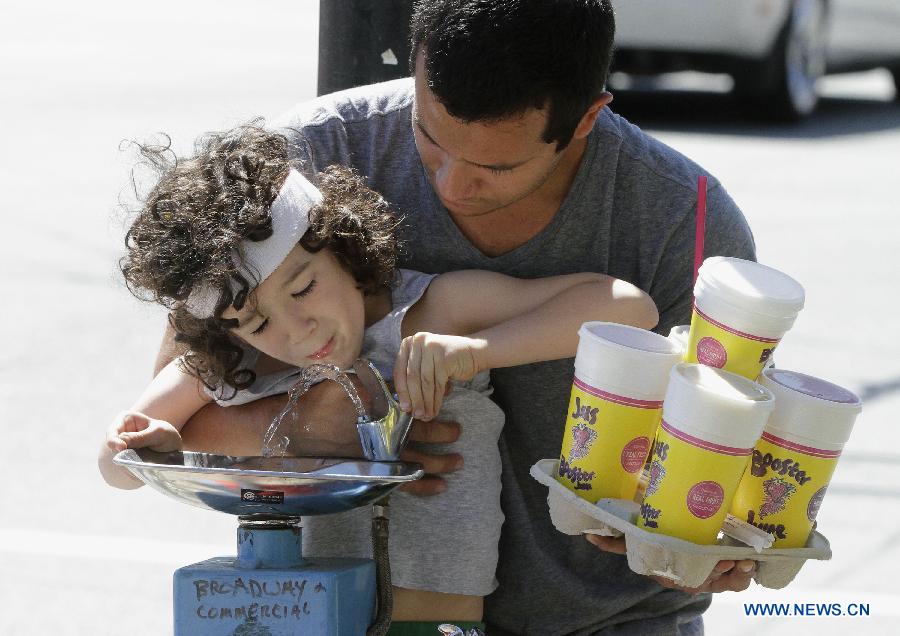 Residents drink water from a temporary drinking fountain at a street in Vancouver, Canada, June 27, 2015. According to the weather forecast from Environment Canada, heat wave warning was issued in Vancouver with temperature expected to rise dramatically over the weekend with about 30 degree Celsius. The inland of British Columbia may hit at 40 degree.(Xinhua/Liang sen)