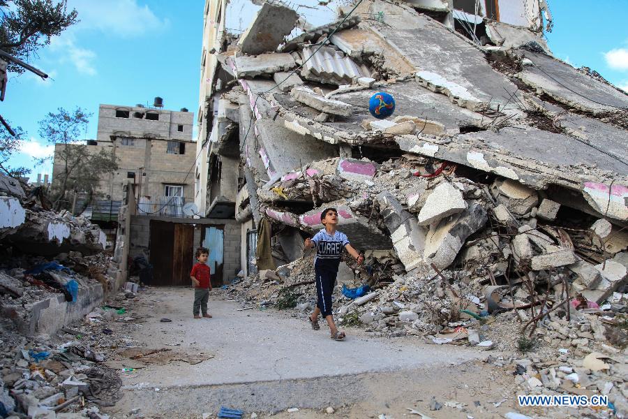 Palestinian children play in the rubble of buildings, which were destroyed during the 50-day war between Israel and Hamas in the summer of 2014, in Gaza City on June 22, 2015. A United Nations report said on June 22 that serious violations of international humanitarian law and international human rights law were committed by both Israel and Palestinian armed groups in the 2014 Gaza conflict. (Xinhua/Wissam Nassar)