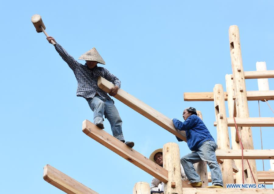 People of the Dong ethnic group take part in the construction of a drum tower at Rentang Village of Sanjiang Dong Autonomous County, southwest China's Guangxi Zhuang Autonomous Region, June 27, 2015. Drum tower is a landmark structure of the villages of the Dong ethnic group where important public affairs are dealt with. (Xinhua/Gong Pukang)