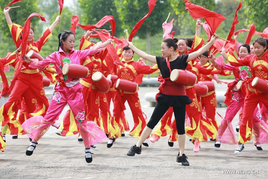Villagers practice drum dance at the guidance of a professional choreographer at Dongzhongxu Village of Wuzhi County, central China's Henan Province, June 28, 2015. (Xinhua/Feng Xiaomin)