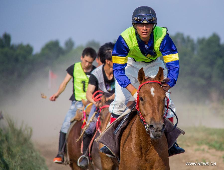 Participants take part in horse racing during a Nadam fair in Hohhot, capital of north China's Inner Mongolia Autonomous Region, June 28, 2015. Nadam is a mass traditional Mongolian festival where people celebrate harvests and pray for good luck. (Xinhua/Ding Genhou)
