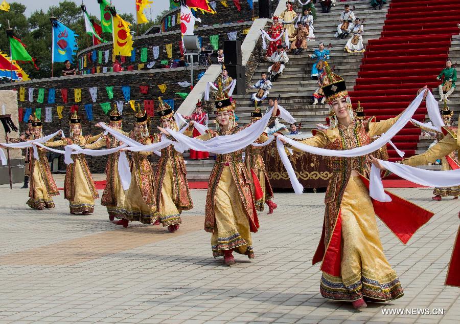 People perform folk dance during a Nadam fair in Hohhot, capital of north China's Inner Mongolia Autonomous Region, June 28, 2015. Nadam is a mass traditional Mongolian festival where people celebrate harvests and pray for good luck. (Xinhua/Ding Genhou)