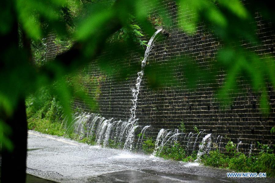 Water seeps through the city wall built in Ming Dynasty (1368-1644) in Nanjing, capital city of east China's Jiangsu Province, June 27, 2015. Rainstorms hit the city on Saturday. Raindrops went through the drainage system in the ancient city wall and were drained to the ground. (Xinhua/Wang Yuewu)
