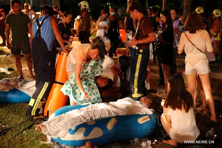 People injured in a fire are attended at a park in New Taipei, southeast China's Taiwan, June 27, 2015. A fire, which was suspected of resulting from explosion of a large amount of unknown flammable powder, in a recreational park in Taiwan's New Taipei city on Saturday has injured at least 474 people. (Xinhua)
