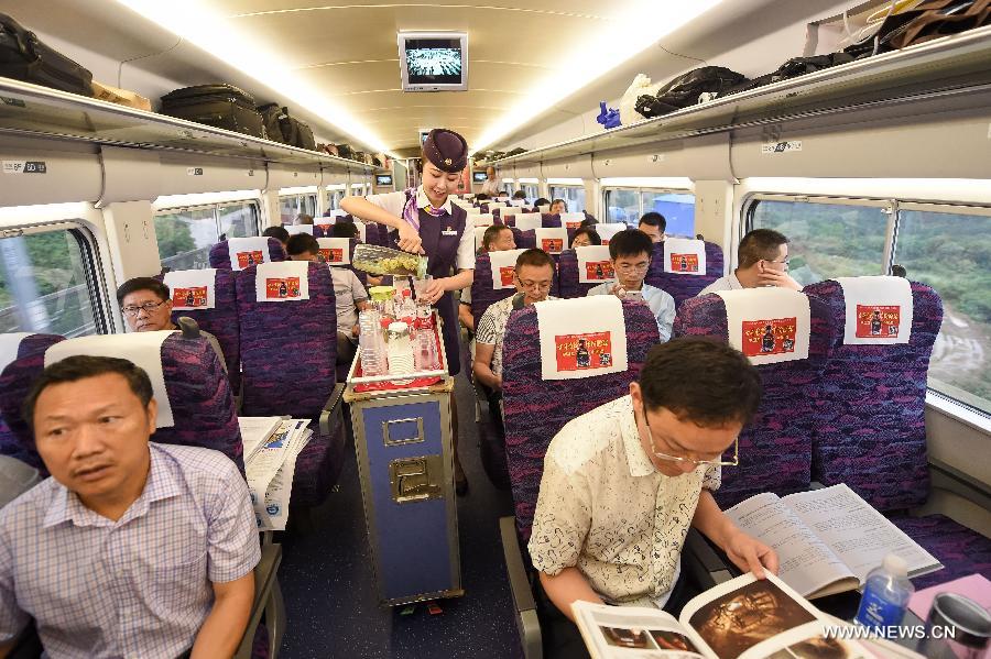 | A steward serves passengers on the G2621 high-speed train from Hefei South to Fuzhou, June 28, 2015. The Hefei-Fuzhou high-speed railway was put into operated on Sunday, which spans east China's Anhui, Jiangxi Provinces and also southeast China's Fujian Province and shortens the travel hours from Hefei to southeast China's Fuzhou to within four hours. (Xinhua/Zhang Duan) |