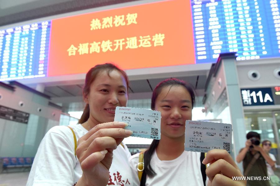 Passengers show their tickets for the G2621 high-speed train at the Hefei South Railway Station in Hefei, capital of east China's Anhui Province, June 28, 2015. The Hefei-Fuzhou high-speed railway was put into operated on Sunday, which spans east China's Anhui, Jiangxi Provinces and also southeast China's Fujian Province and shortens the travel hours from Hefei to southeast China's Fuzhou to within four hours. (Xinhua/Guo Chen)