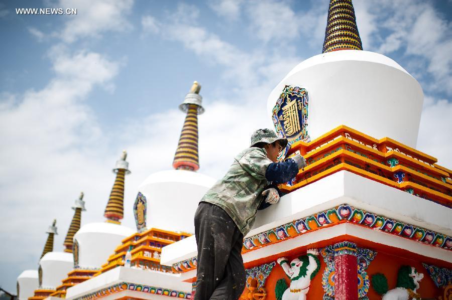 A staff member paints the pagoda at the Taer Monastery in Huangzhong County, northwest China's Qinghai Province, June 27, 2015. As peak tourism season falls recently, eight pagodas in the entrance of the Taer Monastery were repainted to welcome the visitors. (Xinhua/Wu Gang)