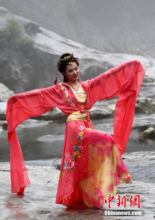 A model takes part in the ancient costume round of the fourth "Find China's Most Beautiful Seven Fairies" contest in Jinzhai county, east China's Anhui province, June 27, 2015. (CNS/Hu Jilin)