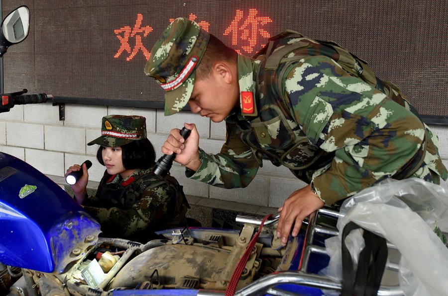 Zhang Liu (L) inspects a motorcycle with her comrades.(Photo/ Xinhua)