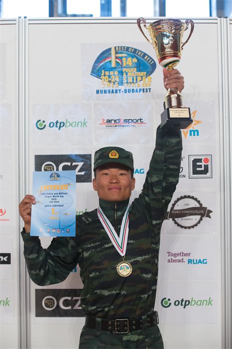 Chen Jun who won the police individual category lifts the trophy on June 23, 2015.