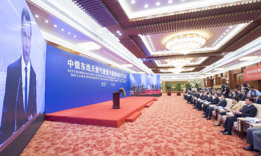 Chinese Vice Premier Zhang Gaoli and Russian Prime Minister Dmitry Medvedev attend a televised ceremony held simultaneously in China and Russia to mark the start of construction on the Chinese section of the China-Russia East Route natural gas pipeline, in Beijing, capital of China, June 29, 2015. (Xinhua/Wang Ye)