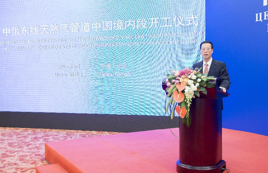 Chinese Vice Premier Zhang Gaoli addresses the ceremony marking the start of construction on the Chinese section of the China-Russia East Route natural gas pipeline in Beijing, capital of China, June 29, 2015. Russian Prime Minister Dmitry Medvedev joined Zhang at the televised inauguration ceremony. (Xinhua/Wang Ye)
