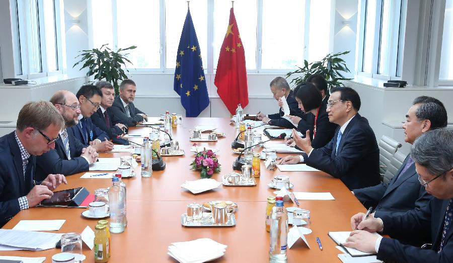 Chinese Premier Li Keqiang (3rd R) meets with President of the European Parliament Martin Schulz (2nd L) in Brussels, Belgium, June 29, 2015. (Xinhua/Pang Xinglei)