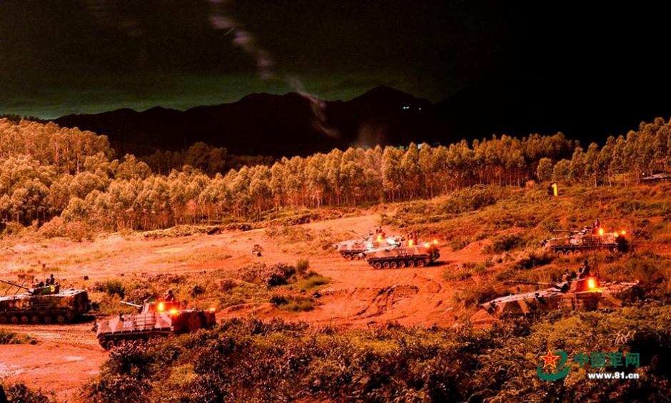 Recently, PLA soldiers from the 42nd Group Army, Guangzhou Military Region, Hainan Provincial Military District, PLA Hong Kong Garrison and PLA Macao Garrison conduct a drill at night in eastern Guangdong. (Photo/81.cn)
