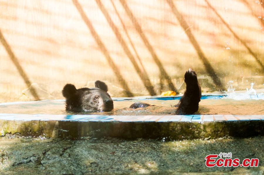 A black bear enjoys cool water at a zoo in Liuzhou city, Southwest China’s Guangxi Zhuang autonomous region, June 30, 2015. The zoo has tried different ways to help animals feel cool as the city suffered lingering heat waves. Temperature rose to 36 degrees Celsius on Tuesday. (Photo: China News Service/Huang Weiming)