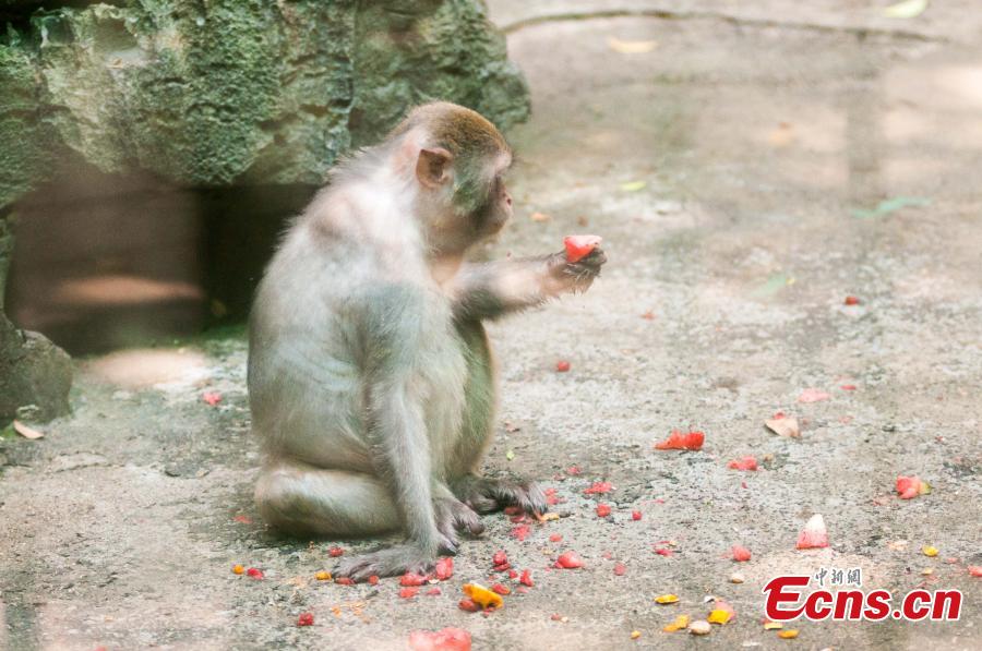 A monkey chews watermelon at a zoo in Liuzhou city, Southwest China’s Guangxi Zhuang autonomous region, June 30, 2015. The zoo has tried different ways to help animals feel cool as the city suffered lingering heat waves. Temperature rose to 36 degrees Celsius on Tuesday. (Photo: China News Service/Huang Weiming)