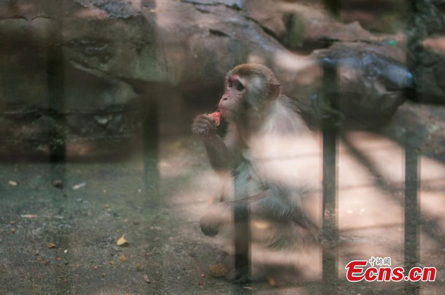 A monkey chews watermelon at a zoo in Liuzhou city, Southwest China’s Guangxi Zhuang autonomous region, June 30, 2015. The zoo has tried different ways to help animals feel cool as the city suffered lingering heat waves. Temperature rose to 36 degrees Celsius on Tuesday. (Photo: China News Service/Huang Weiming)
