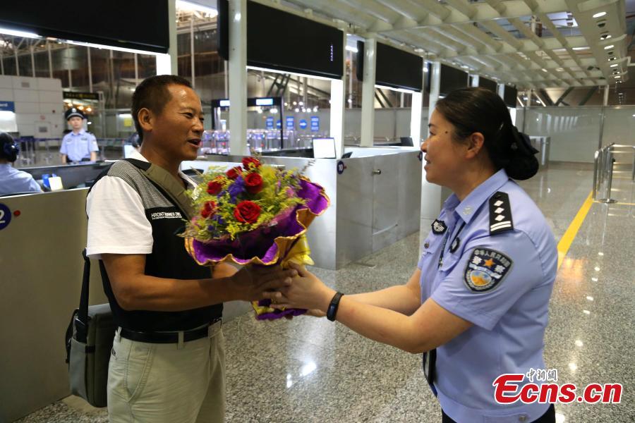 A Taiwan man is greeted with flowers at a port in Guangzhou, South China’s Guangdong province, July 1, 2015. The man was the first to visit the mainland after the mainland removed the entry permit requirement for Taiwan residents starting from July 1. In the past, Taiwan residents had to apply for a visa-like entry permit to visit the mainland. (Photo: China News Service/Xie Daxin)
