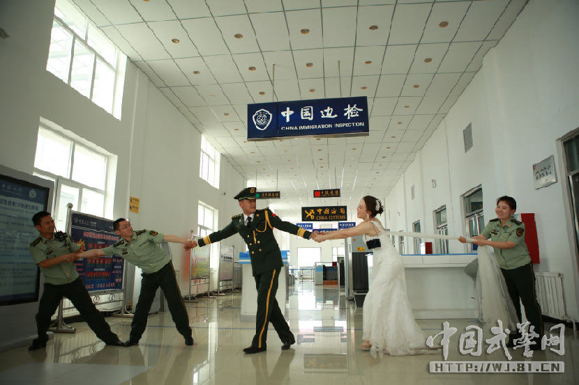 At the border between China and Kazakhstan, Mulati, an ethnic Kazakh police officer at the Dulata border inspection station, has a romantic wedding with his bride Senbati, who is also ethnic Kazakh, on May 28, 2015. (Photo/wj.81.cn)
