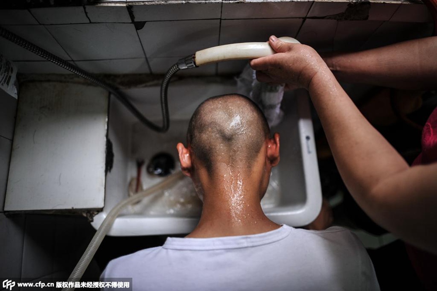 Eleven Chinese fathers who have their heads shaved set up a bald father supporting group for those children with leukemia in China. (Photo/ CFP)