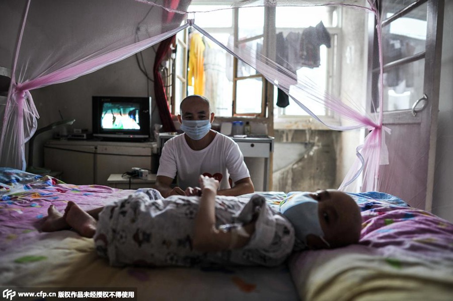Eleven Chinese fathers who have their heads shaved set up a bald father supporting group for those children with leukemia in China. (Photo/ CFP)