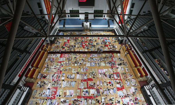 Thousands of students in Central China Normal University in Wuhan, Hubei province stay overnight in the university 's stadium where air-condition was turned on to avoid summer heat on June 29, 2015. The maximum air temperature of Wuhan reached 35 degree centigrade that day. It’s said many dorms in the university had not been equipped with air condition.