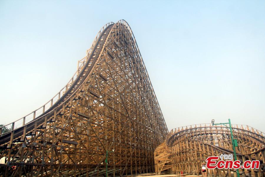 | A wooden roller coaster makes its debut in Wuhu city, East China’s Anhui province, July 1, 2015. The structure is 1060 meters long, 32 meters high at its highest point, and allows for speeds of up to 91 km/h. It claims to be the largest wooden roller coaster in East China. (Photo: China News Service/Li Qingsong) |