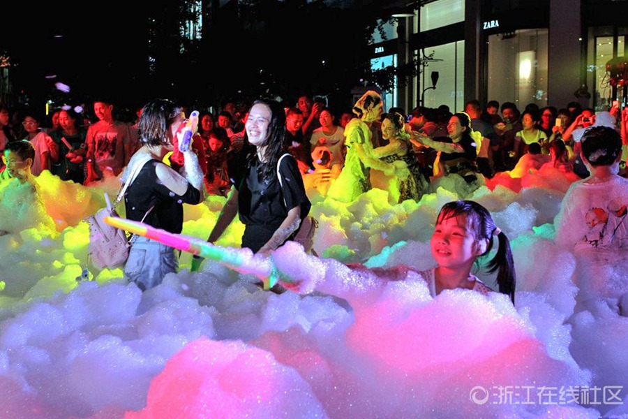 Participants to a night foam party revel in colorful bubbles in front of a shopping mall in the walking street in Jinhua, east China's Zhejiang province on July 1, 2015. (Photo/ zjol.com.cn)