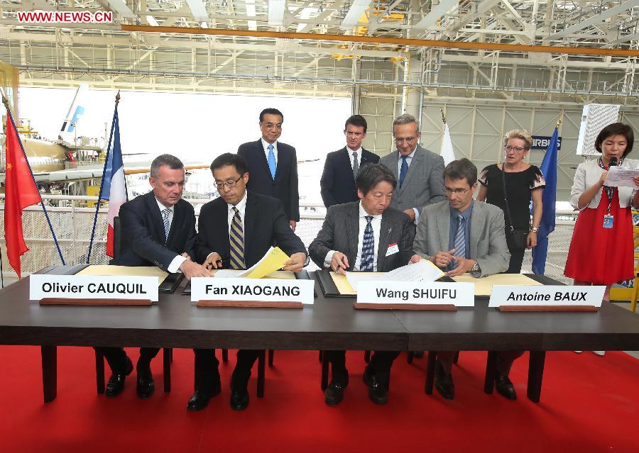 Chinese Premier Li Keqiang (L Back) and French Prime Minister Manuel Valls (R Back) attend the signing ceremony of cooperation agreements at the headquarters of Airbus in Toulouse, France, July 2, 2015. (Xinhua/Pang Xinglei)