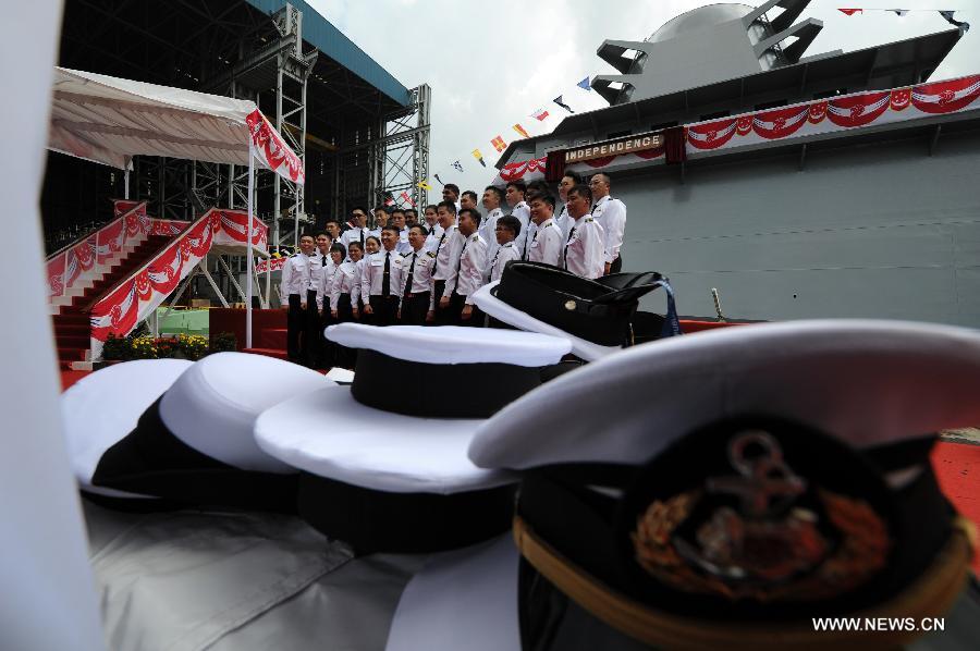 | The crew of littoral mission vessel "RSS Independence" attend a launch ceremony at Singapore's ST Marine Benoi Shipyard, July 3, 2015. Singapore's Navy on Friday held a launch ceremony for its very first of six littoral mission vessels "RSS Independence". (Xinhua/Then Chih Wey) |