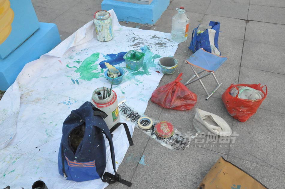 Brushes and paints are placed on the ground. (yx.iqilu.com/Zhang Jingang)