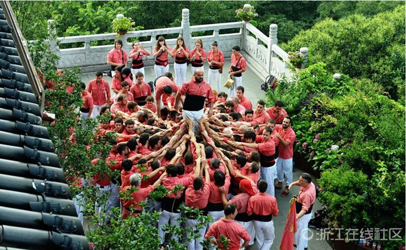 A total of 190 performers from Spain build human towers - 'Castells', a Catalan tradition originating in the 18th century, on July 2, 2015 in Hangzhou, east China. (Photo/ zjol.com.cn)