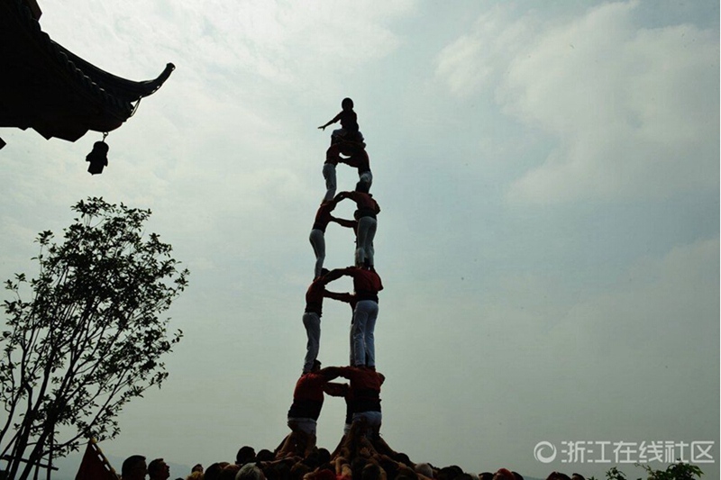 | A total of 190 performers from Spain build human towers - 'Castells', a Catalan tradition originating in the 18th century, on July 2, 2015 in Hangzhou, east China. (Photo/ zjol.com.cn) |