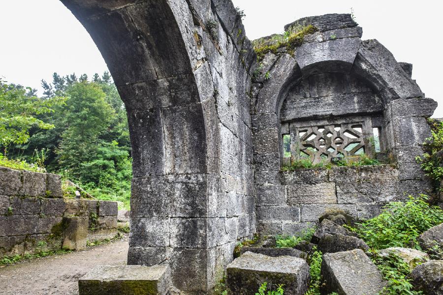 | Photo taken on July 3, 2015 shows a scene of Hailongtun Fortress in southwest China's Guizhou Province. Tusi sites -- the remains of an ancient political system adopted by Chinese emperors to govern ethnic minority regions in south-central and southwest China -- were inscribed in the World Heritage List on Saturday. The inscribed sites, located in mountainous areas, are Laosicheng in Hunan Province, Tangya in Hubei Province and Hailongtun Fortress in Guizhou Province. Tusi literally means hereditary tribal headmen appointed by Chinese emperors to govern the often unruly ethnic minority regions in the central and western parts of south China, where the specific tribal governance system was adopted from the 13th to the early 20th century. (Xinhua/Liu Xu) |