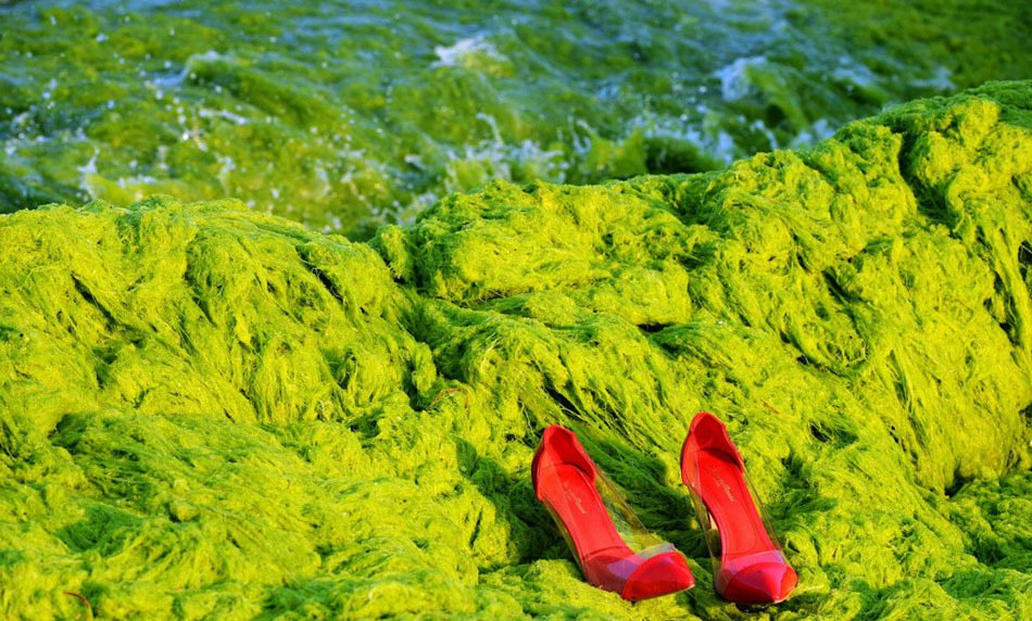 A pair of red high heels in enteromorpha on the shore. (Photo/China Youth Daily)