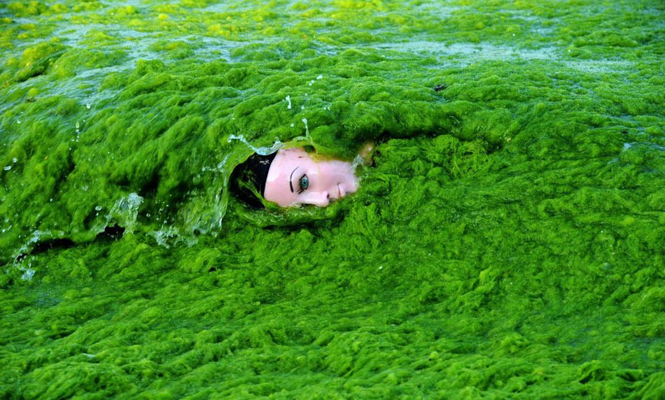 A great amount of enteromorpha hits the Qingdao coast, east China’s Shandong province on July 4, 2015. Continuous south wind has blown the enteromorpha to the sea shore of Qingdao.