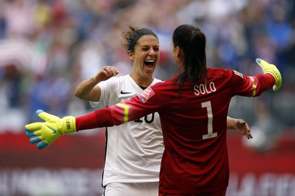 United States midfielder Carli Lloyd (10) celebrates with goalkeeper Hope Solo (1) after scoring against Japan during the first half of the final of the FIFA 2015 Women's World Cup at BC Place Stadium. [Photo/Agencies]